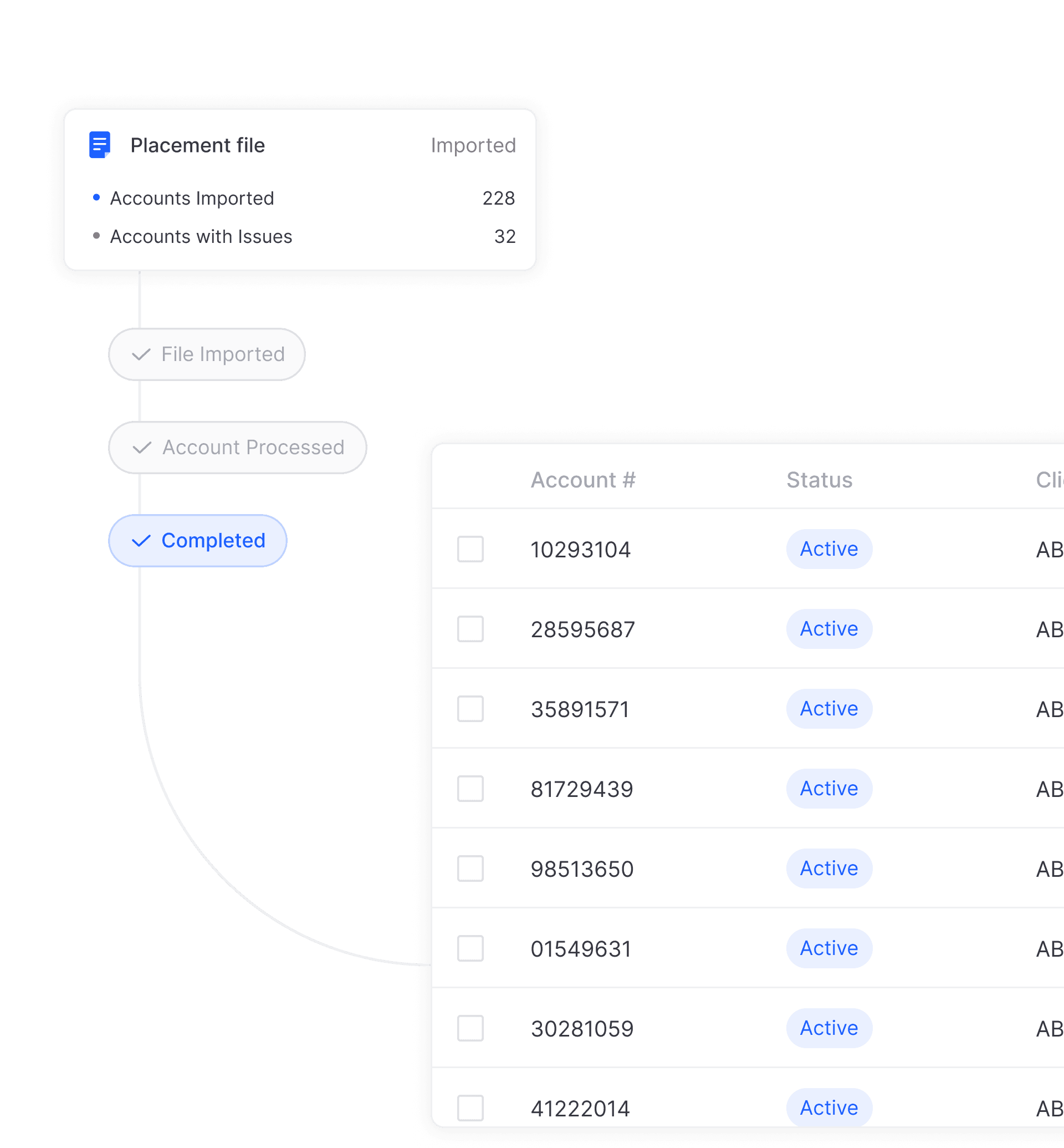 Utilize Fiber’s AI-driven Import Wizard, purpose-built to intelligently process client files. Partially accept files with missing or incorrect information and enable agents to start working on placed accounts faster than legacy systems.